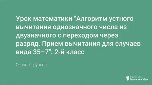 Урок по математике для 2-го класса представлен по УМК «Школа России». Дети знакомятся с новым приёмом вычитания 35–7. Учащиеся выводят алгоритм устного вычитания однозначного числа из двузначного с переходом через разряд. Герои мультфильма «Мама для мамонтёнка» способствуют развитию учебно-познавательного интереса к новому материалу и способам решения новой учебной задачи.