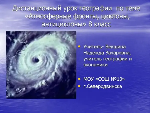 Дистанционный урок по теме «Атмосферные фронты. Циклоны и антициклоны» можно использовать в классе для самостоятельной работы учащихся с компьютерной программой, обучающимся на дому, живущим в отдаленных районах области, находящихся на дистанционном обучении.