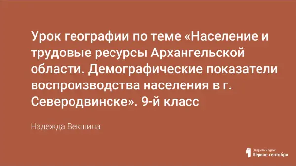 Урок географии в 9-м классе представляет собой исследование, целью которого – изучить демографическую ситуацию воспроизводства населения в городе Северодвинске, используя материалы газеты «Северный рабочий» за 2009 год. На краеведческом материале в ходе урока показаны демографические процессы, которые происходят в естественном движении населения города (области).