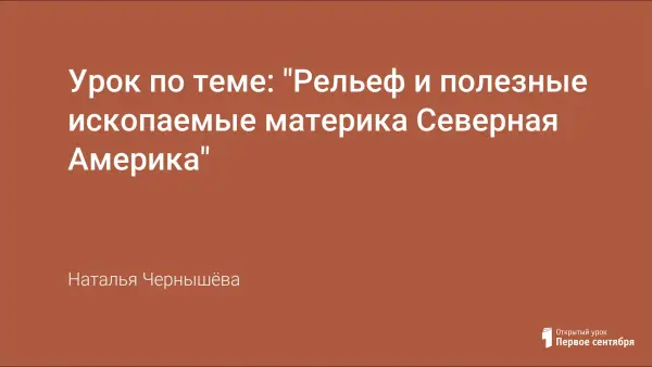 Разработка открытого урока, основными целями которого является: показать особенности и общие черты рельефа Северной Америки; расположение крупных форм рельефа в зависимости от истории развития земной коры материка; внешний облик равнин и горных областей материка; закономерности размещения крупных форм рельефа и месторождений полезных ископаемых; антропогенное влияние на рельеф материка.