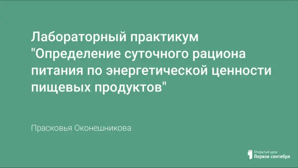 В лабараторном практикуме "Определение суточного питания по энергетической ценности пищевых продуктов" учащиеся определяют свой суточный рацион питания, считая калорийность пищевых продуктов. В конце практикума учащиеся должны сравнить полученную сумму калорийности пищевого рациона с данными таблицы и сделать вывод: правильно ли составлен их суточный рацион и сделать отчетное задание.