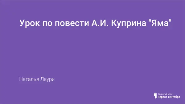 Урок является уроком внеклассного чтения и продолжает разговор о творчестве А. И. Куприна. Повесть "Яма" - это плод раздумий писателя над проблемой продажной любви, ее социальными, нравственными и психологическими аспектами. Она обращена к вечным проблемам добра и зла, нравственной чистоты и порочности.
