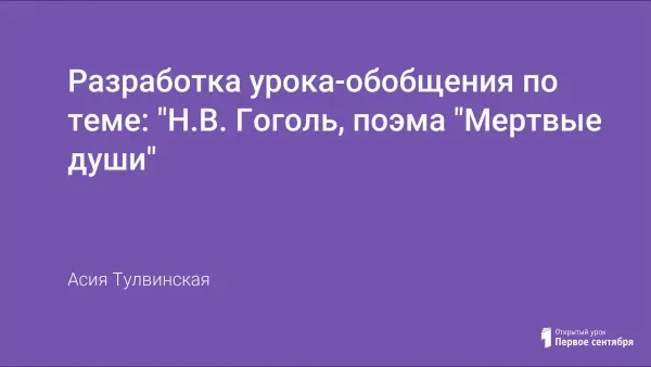 Урок-обобщение по теме "Н.В. Гоголь, поэма "Мертвые души" систематизирует накопленный материал, помогает разрешить противоречие между "высоким" жанром поэмы и сознательно сниженным, но таким "замашистым" языком. На уроке закладывается дальнейшая линия изучения литературы, "вышедшей из Гоголя", рассматриваются некоторые интертекстуальные связи. Разработка имеет дополнительный материал, который является результатом работы над текстом на предыдущих уроках и представляет как самостоятельный интерес, так и специальный - в классах, изучающих риторику.