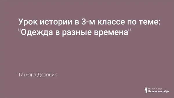 Урок истории в 3-м классе по программе Е.В.Саплиной, по теме "Одежда в разные времена". На данном уроке решается наиболее актуальный вопрос образования - формирование гражданских качеств на основе краеведческого материала. На уроке используются элементы костюмирования, осуществляются межпредметные связи. Урок способствует развитию кругозора, познавательной активности, побуждает к исследованию объектов истории, вызывает интерес к истории родного края.
