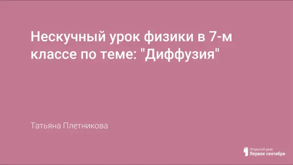 Урок по теме "Диффузия" проводится в 7-м классе (учебник А.В. Перышкин, М, "Дрофа", 2000). Тема урока является промежуточной в изучении первоначальных сведений о строении вещества. Демонстрационные и фронтальные эксперименты позволяют наглядно представить изучаемое явление, выявить его физическую сущность и дать сравнительную характеристику. Ход и содержание урока позволяют выявить глубину и систематичность усвоения изучаемого материала. Актуализация экспериментов, использование различных способов активизации мыслительной деятельности позволяет отнести этот урок к "нескучным" урокам физики.