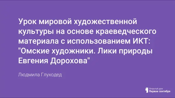 Представлен конспект урока мировой художественной культуры на основе краеведческого материала с применением ИКТ "Омские художники. Лики природы Евгения Дорохова". Для гармонического развития ребенка необходимо создавать вокруг него пространство, воздействующее как на сферу разума, так и на чувственную сферу. Средством, способным решить данную задачу, является искусство. Воспитание патриотизма, гражданственности, любви к своей Родине начинать лучше с родного порога. С малой родины. Взаимодействие искусствоведческих и краеведческих задач поможет в становлении духовно-нравственной личности.