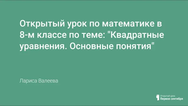 Представлен открытый урок по математике в 8-м классе. На уроке достигаются следующие цели: воспитательная - воспитание общечеловеческих ценностей; образовательная - отработка навыков устного счёта; ввести понятия: квадратное уравнение, приведённое квадратное уравнение, неприведённое квадратное уравнение, полное квадратное уравнение, неполное квадратное уравнение, корень квадратного уравнения, решение квадратного уравнения.