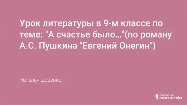 Урок литературы в 9-м классе был проведен как обобщающий, итоговый. Мне как учителю было важно, чтобы дети поняли, что это не история о несчастной любви и не рассказ о судьбе дворянина-аристократа 20-ых годов XIX века. Проблематика романа гораздо шире - философия потребления мира человеком, которая, в конечном итоге, делает его самого несчастным. При таком прочтении романа поступки героев Лермонтова, Достоевского, Толстого буду г учащимся более понятны. Евгений Онегин не будет воспринят как герой только своей эпохи. В России всегда было превосходство духовного над материальным. Литературные герои будут страдать, пока не осознают это.