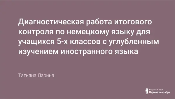 Цель диагностической работы - определить уровень подготовки учащихся 5-х классов по немецкому языку и выявить элементы содержания, вызывающие наибольшие затруднения. Работа состоит из 15 заданий: 13 заданий с выбором ответа из нескольких и 2 задания с кратким ответом, и включает разделы «Чтение», «Лексика» и «Грамматика».