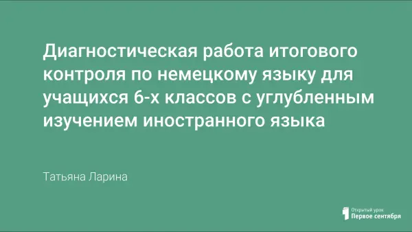 Данная диагностическая работа подготовлена для учащихся 6-го класса, первый год изучающих немецкий язык как второй иностранный. Ее цель - определить уровень подготовки учащихся 6-х классов по немецкому языку и выявить элементы содержания, вызывающие наибольшие затруднения. Работа состоит из 12 заданий: 9 заданий с выбором ответа из нескольких, 2 задания с кратким ответом, одно задание с развернутым ответом, и включает разделы «Чтение», «Лексика», «Грамматика» и «Письмо».