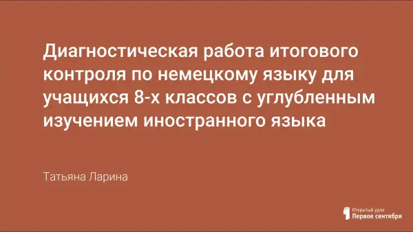Данная диагностическая работа подготовлена для учащихся 8-го класса, четвертый год изучающих немецкий язык как второй иностранный. Ее цель - определить уровень подготовки учащихся 8-х классов по немецкому языку и выявить элементы содержания, вызывающие наибольшие затруднения. Работа состоит из 13 заданий: 9 заданий с выбором ответа из нескольких, 3 задания с кратким ответом, одно задание с развернутым ответом, и включает разделы «Чтение», «Лексика», «Грамматика» и «Письмо».