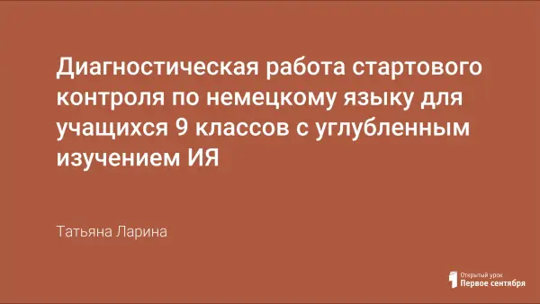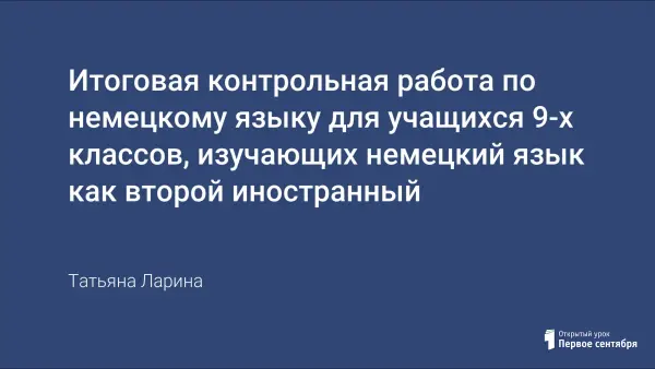 Данная диагностическая работа подготовлена для учащихся 9-го класса, пятый год изучающих немецкий язык как второй иностранный. Ее цель – определить уровень подготовки учащихся 9-х классов по немецкому языку. Работа состоит из 4-х заданий: 2 задания с выбором ответа из нескольких, 1 задание с кратким ответом, одно задание с развернутым ответом, и включает разделы «Чтение», «Лексика», «Грамматика» и «Письмо».
