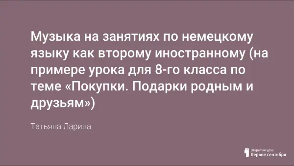 Среди многообразия дидактических приемов, применяемых на занятиях по немецкому языку следует остановиться на музыке. При ее использовании развиваются речевые умения аудирования и говорения, происходит активизация и расширение лексики, углубляется изучаемая тема и, конечно, учащиеся получают страноведческую информацию. В качестве примера приведен один из уроков темы «Покупки. Подарки родным и друзьям» для учащихся 8-го класса, изучающих немецкий язык четвертый год как второй иностранный 2 часа в неделю. Данный урок свидетельствует об актуальности использования музыкального материала при изучении иностранного языка, который помогает активизировать употребление изученной лексики в аудировании, чтении и устной речи, способствует расширению общеобразовательного кругозора, пополнению страноведческих и лингвистических знаний, а также позволяет повышать и поддерживать интерес и мотивацию учащихся, стимулирует их учебную и коммуникативную деятельность.