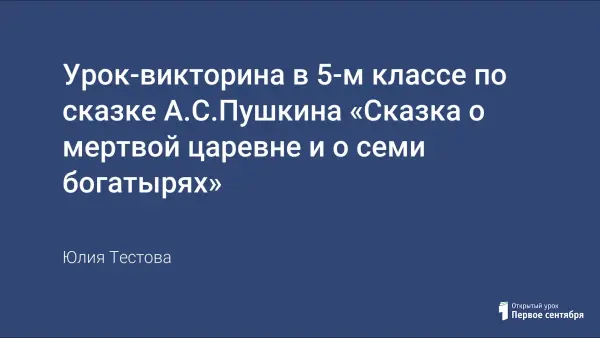 Урок является итоговым после прочтения сказки А.С.Пушкина «Сказка о мертвой царевне и о семи богатырях» и направлен на проверку знаний учащихся, раскрытие их творческого потенциала, закрепление пройденного материала. Урок построен в виде викторины с заданиями по тексту сказки и творческими заданиями.