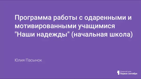 В статье представлена программа работы с одаренными и мотивированными учащимися «Наши надежды». Определены направления и этапы работы, предложены варианты диагностики детской одаренности и мотивационной готовности педагогов к работе с одаренными детьми.