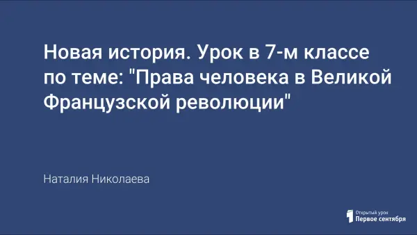 Урок по теме: "Права человека в Великой Французской революции" ставит своей целью воспитание уважения к человеку, его правам. Данный урок может быть вариантом повторительно-обобщающего урока по теме "Великая Французская революция"; материалы к уроку могут быть использованы на уроках обществознания и права.