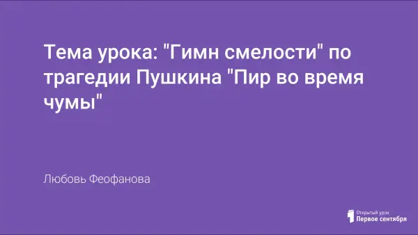 Урок "Гимн смелости" по трагедии А.С.Пушкина "Пир во время чумы" представлен в форме проблемной беседы, в ходе которой происходит осмысление вечных вопросов жизни человека: добра и зла, мужества и смирения, жизни и смерти.