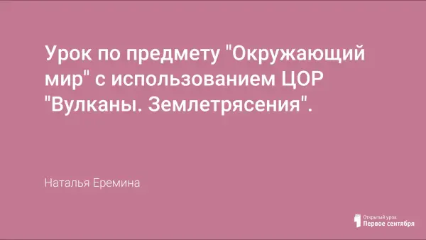Урок окружающего мира во 2-м классе по теме "Вулканы. Землетрясения" знакомит учащихся с причиной возникновения вулканов и землетрясений. Для его подготовки использовались цифровые образовательные ресурсы ("Природоведение. 5-й класс", "География. 6–10-й класс", "География. Начальный курс"), составлена презентация, которая помогает наглядно познакомиться с данной темой.