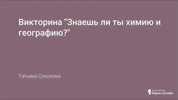 Предлагается межпредметная викторина по теме «Знаешь ли ты химию и географию?». Викторина содержит 37 вопросов, может быть использована не только на уроках, но и во внеклассной работе (например, во время проведения предметных недель в школе).