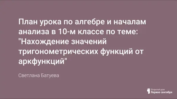 Урок по теме "Нахождение значений тригонометрических функций от аркфункций" - это четвертый урок изучения темы "Решение тригонометрических уравнений и неравенств". На предыдущих уроках учащиеся изучали определение и свойства аркфункций, что подготовило ребят к успешному изучению данной темы. Материал урока не изложен в учебнике, но содержится в программе Единого Государственного экзамена и Всероссийского централизованного тестирования.