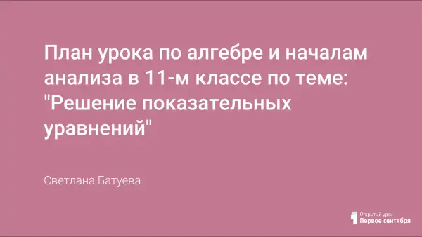 Конспект комбинированного урока, рассчитанного на два часа. Это пятый урок в разделе "Показательная и логарифмическая функции", первый урок по решению показательных уравнений. На предыдущих уроках учащиеся изучали определение и свойства показательной функции, решали графически уравнения, содержащие переменную в показателе степени. Урок проводился с учащимися, имеющими разный уровень подготовки и развития, по учебнику А.Н. Колмогорова, и др. Алгебра и начала анализа для 10-11-х классов средней школы.