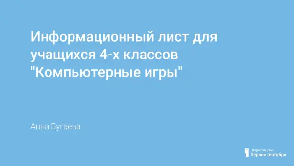 Название материала "Информационный лист для учащихся 4-х классов "компьютерные игры". Раздел – внеклассная работа. Материал знакомит учащихся с историей, развитием и видами компьютерных игр.