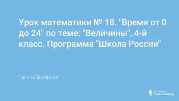 Разработка урока изучения нового материала, в ходе которого учащиеся знакомятся с 24-часовым отсчетом времени в сутках, упражняются в решении задач на время, совершенствуют вычислительные навыки и знания о величинах. На уроке используются такие формы работы как фронтальная работа, самостоятельная работа и индивидуальная работа. Урок составлен по материалам учебника для 4-го класса начальной школы и "Математика" 1 часть, авторов М.И.Моро, М.А. Бантовой и др.