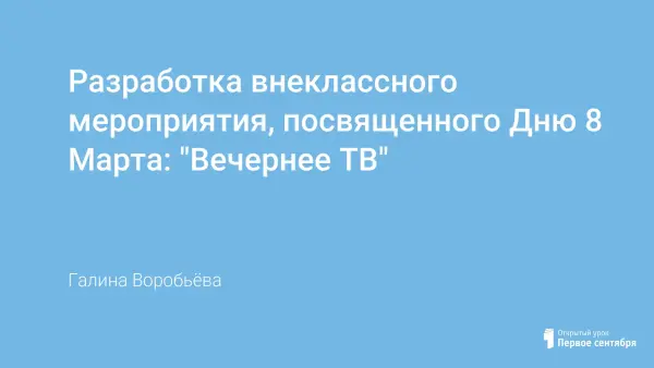 В данной разработке представлен сценарий внеклассного мероприятия, посвященного Дню 8 Марта, для учащихся 6-х классов в форме телепередачи. При проведении такого мероприятия развивается творческая инициатива и активность учащихся, формируется чувство ответственности за порученное дело, воспитывается уважительное отношение к девочкам.
