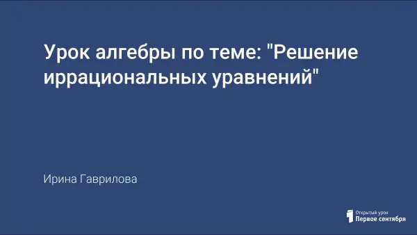 На данном уроке рассматриваются различные способы решения иррациональных уравнений: метод замены переменных, учет О.Д.З., умножение обеих частей уравнения на сопряженное выражение. Также на уроке используются групповая, индивидуальная и фронтальная формы работы.