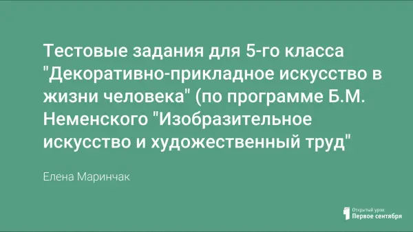 Тестовые задания для 5-го класса «Декоративно-прикладное искусство в жизни человека» предназначены для определения уровня теоретических знаний по определённым темам программы Б.М. Неменского «Изобразительное искусство и художественный труд». Целесообразно их применение на итоговом уроке в конце каждой четверти. Отвечая на вопросы, ребята могут заполнять бланки определённого образца или давать развёрнутые полные ответы на поставленные вопросы.