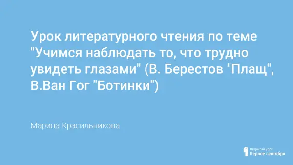 Данный урок литературного чтения – двенадцатый в главе "Учимся наблюдать и копим впечатления" (3-й класс. УМК ПНШ: Н.А.Чуракова. Литературное чтение). Основная идея этой части главы: учиться видеть не только глазами, но и сердцем, задумываться о жизни других людей. Содержание урока по теме "Учимся наблюдать то, что трудно увидеть глазами" на примере произведений В.Берестова "Плащ", В.Ван Гога "Ботинки" соответствует поставленным целям и задачам. Формы работы, методы организации отражают направленность на личность учащихся, на формирование ОУУН учащихся.
