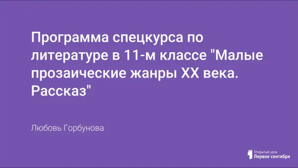 Главная задача курса - научить анализу художественного произведения, полнее представить творчество заявленных писателей и литературный процесс XX века в целом, узнать специфику и художественные особенности жанра рассказа. Материал программы строится на изучении малых прозаических жанров в историческом аспекте. Предлагаемые учащимся творческие работы с выбором жанров позволяют развить умения, связанные с художественной интерпретацией, литературоведческим анализом, критико-публицистической оценкой представленных произведений.