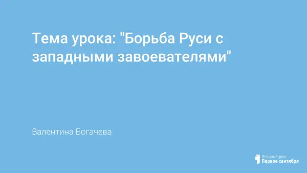 Интегрированный урок история–музыка в 6-м классе по теме "Борьба Руси с западными завоевателями" разработан на основе обязательного минимума содержания исторического образования в соответствии с примерной федеральной программой основного общего образования. Во главу урока поставлена цель, создать представление о том, какой трудной и дорогой ценой удалось русскому народу остановить и ослабить вторжение крестоносцев. Главное внимание на уроке уделяется изучению полководческого таланта Александра Невского, образ которого не раз приходил на выручку в годы Великой Отечественной войны офицерам и солдатам. Также на уроке уделяется внимание воспитанию любви к Родине через музыку.