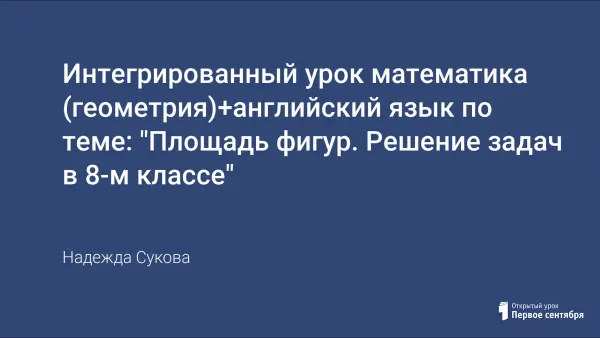 В МОУ "Общеобразовательная гимназия №6" г. Архангельска с 1 класса изучается углубленный курс английского языка. Математика и иностранный язык являются обязательными предметами во всех школах, как общеобразовательных, так и специализированных. К 8 классу ученики достигают определенного уровня знаний по этим предметам. Поэтому был подготовлен урок геометрии в 8 классе по теме "Площадь фигур. Решение задач" на английском языке.