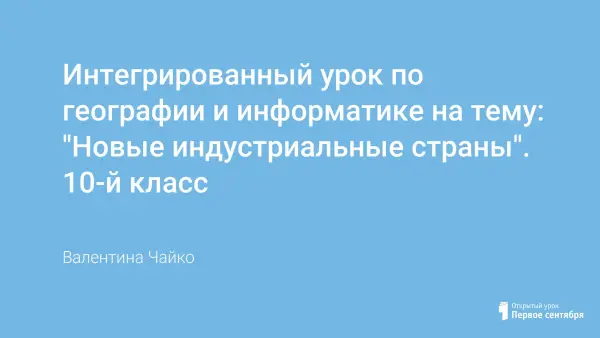 Интегрированный урок географии и информатики для 10-го класса по теме "Новые индустриальные страны". Данный урок представляет собой межпредметные связи географии и информатики. Показывает владение информационными технологиями учащихся 10-го класса. Форма интегрированного урока позволяет создать проект "новых индустриальных стан", в ходе которого учащиеся самостоятельно выделяют главное: экономико-географическое положение, традиции данной страны, а также учатся анализировать статистические данные.