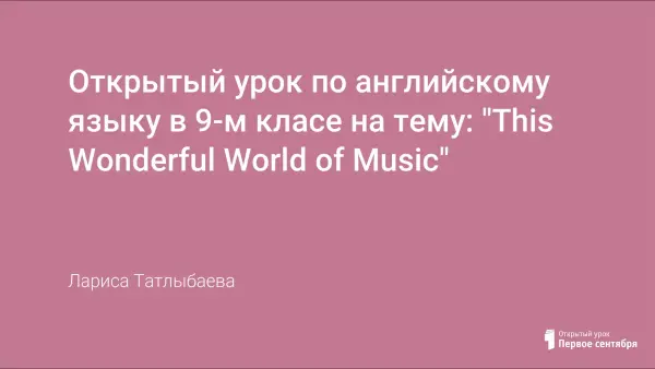 На открытом уроке по теме "This Wonderful World of Music" учащиеся отрабатывают умение в употреблении лексических единиц, развивают навыки аудирования, чтения, говорения по теме "Музыка", учатся извлекать необходимую информацию, формируют навыки активного речевого поведения.