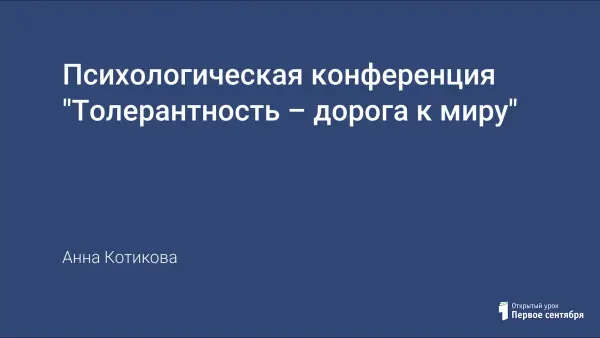 Понимание толерантности не однозначно в разных культурах, оно зависит от исторического опыта народов. Наша задача — не просто научить толерантному поведению и выработать общую установку на принятие другого, а сформировать такое качество личности, которое можно обозначить как активная толерантность, формула которой: понимание, плюс сотрудничество плюс дух партнерства. Что же это такое и каковы её особенности, вы и узнаете в ходе конференции.