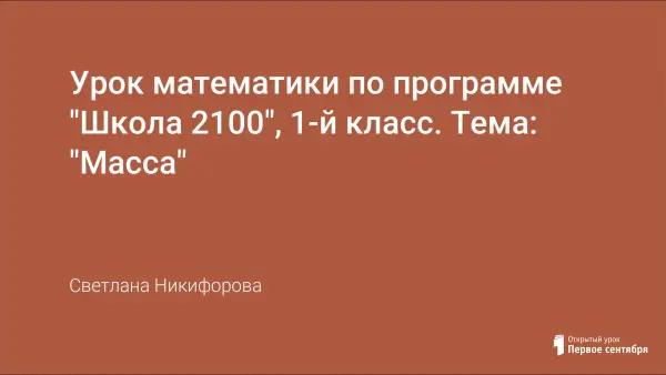 Разработка урока для начальных классов, цели которого познакомить с величиной - массой, единицами измерения массы, различными видами весов; закрепить знания о величинах и общем принципе их измерения; учить практически сравнивать предметы по массе с помощью весов; развивать мыслительные операции: внимание, память, речь, познавательный интерес, творческие способности. В уроке реализован деятельностный подход в обучении.