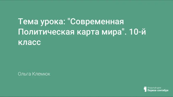 Урок проводится на основе мультимедийной презентации. При изучении темы "Современная политическая карта мира" в 10-м классе. Может быть использован, как урок изучения нового материала, так и для самостоятельного изучения учащимися данной темы. Изучение данной темы дает возможность узнать о основных этапах формирования современной политической карты мира, о изменениях, которые происходят и причинах этих изменений, количественного и качественного характера, типологии стран современного мира и их разнообразии по формам правления и государственно- территориального устройства. Урок проводится с использованием проектора или в компьютерном классе. Содержание урока строится по принципу последовательного изложения материала с синхронным просмотром на мониторах компьютеров или воспроизведением на экране проектора. Усвоение информации с применением компьютера происходит более глубокое, что положительно сказывается на результатах обучения.