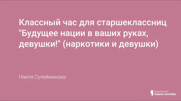 Сегодня невозможно молчать о такой важной проблеме, как употребление молодыми людьми наркотических средств, которые особенно пагубно отражаются на здоровье девушек - будущих мам. Классный час имеет целью антинаркотическую пропаганду, половое воспитание, воспитание здорового образа жизни, патриотическое воспитание.