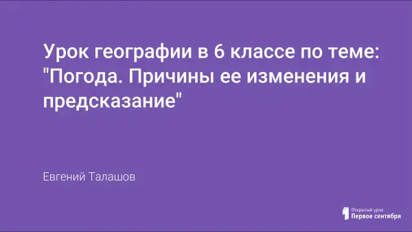 Представленный материал является методической разработкой урока географии в 6 классе по теме "Погода". Образовательные и воспитательные цели состоят в развитии умения устанавливать причинно-следственные связи между элементами погоды, свободно добывать знания на основе сотрудничества.