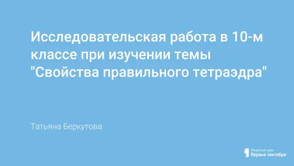Одной из форм для решения вопросов мотивации школьников к учению выступает учебно-исследовательская деятельность. Часто учителю приходится придумывать темы для организации такой деятельности. Под исследовательской деятельностью учащихся будем понимать творческий процесс совместной деятельности учителя и ученика по поиску решения не известного до этого факта, а темы подсказывают и учебник, и сами учащиеся. Так, при изучении темы "Пирамиды" в 10-м классе особый интерес вызывают: центр симметрии, точка пересечения осей и плоскостей симметрии; новые геометрические фигуры, полученные в результате сечений в тетраэдре.