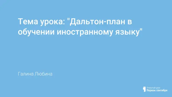 Тему "Дальтон-план в обучении иностранному языку" считаю актуальной. Дальтон-план - это метод работы, "образ жизни", в рамках которого создаются условия, обеспечивающие оптимальное раскрытие каждого ученика. Здесь нет одного центрального аспекта. Дальтон-план опирается на исходное положение о синтезе различных целей. Важными элементами при этом являются учащиеся, работа, общество и его отражение в школьной жизни, окружающая обстановка и задачи.