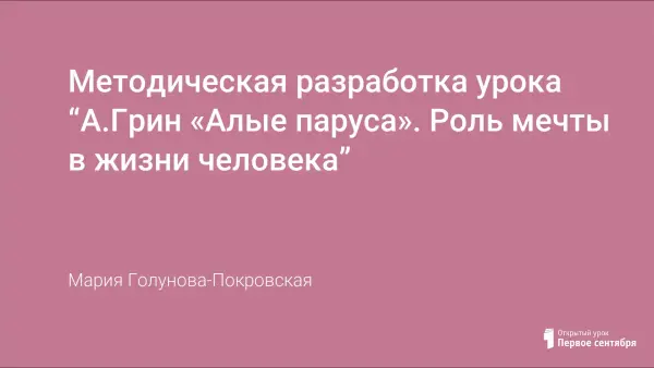 Цели урока: определить, какую роль играет мечта в жизни героев произведения; познакомить учащихся с краткой биографией А.Грина, его произведением "Алые паруса"; знать литературные термины (феерия, повесть, биография, средства художественной выразительности); вызвать интерес к творчеству писателя.