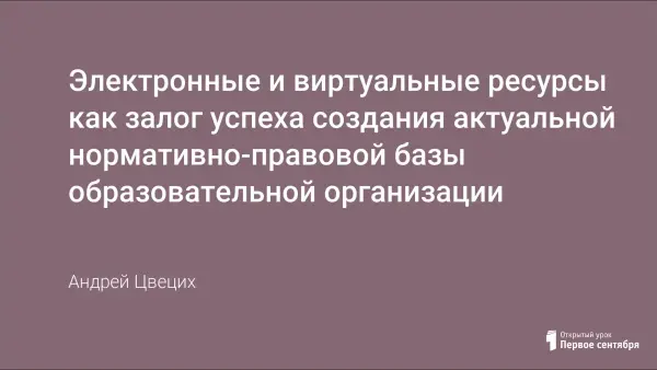 Анализ практики управленческой работы в образовании показывает, что при принятии управленческих решений и разработке нормативно-правовых документов допускается множество нарушений действующего законодательства. В статье представлена модель правового управления образовательным процессом в общеобразовательной организации. Электронные и виртуальные ресурсов − залог успеха создания актуальной нормативно-правовой базы.
