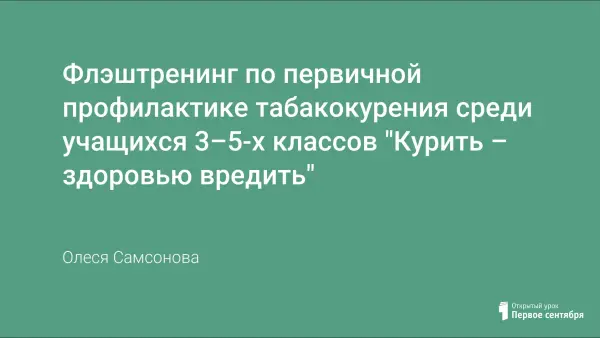 Флэштренинг «Курить – здоровью вредить» проводится для профилактики табакокурения среди младших школьников. Многие учащиеся начальных классов пробовали курить, о чем рассказывают своим сверстникам. Профилактику табакокурения нужно начинать как можно раньше, формировать у детей представление о здоровье человека как самом ценном, пагубном влиянии курения на организм человека, воспитывать умение противостоять дурному влиянию окружающих.