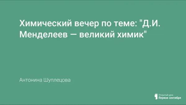 Все эти достижения стали возможными благодаря огромному труду русских ученых, среди которых назовем имя одного из величайших корифеев науки - Дмитрия Ивановича Менделеева. Ему и посвящаем наш вечер.