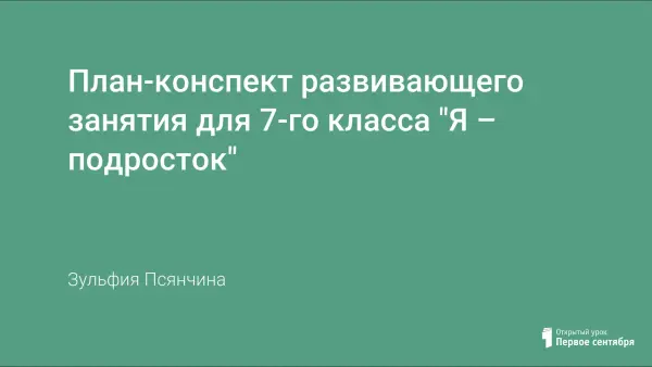 Подростковый возраст является особенным периодом в жизни каждого человека. В этом возрасте стремительно развивается самосознание, происходит открытие собственного Я. Я – концепция подростка часто противоречива и может подкрепляться отрицательным опытом, что определяет формирование тревожности как личностного свойства. При этом преобладает межличностная тревожность, т.е. тревожность возникает в связи с нарушениями отношений со значимыми людьми (сверстниками). Поэтому расширение сознания и развитие способности к внутреннему диалогу через самораскрытие в общении со сверстниками является важным направлением в работе психолога с подростками. Предложенный план-конспект занятия для 7-го класса на тему "Я – подросток" ориентирован на решение вышеуказанной задачи.
