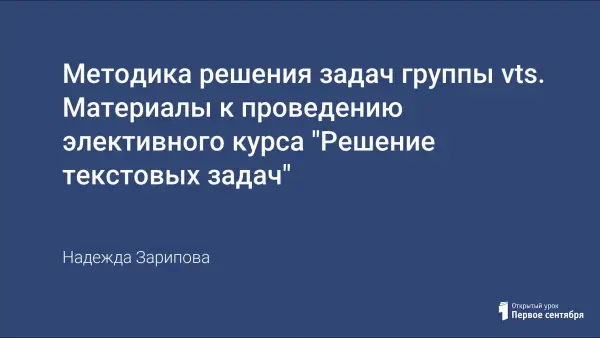Работа составлена согласно программе элективных курсов "Текстовые задачи", разработанной этим же автором и опубликованной в сборнике "Открытый урок – 2005/2006". В ней подробно раскрыта общая методика решения текстовых задач и показаны различные методы решения задач группы vts: алгебраический (с помощью уравнения или систем уравнений) и графический с применением элементов геометрии. В заключение материала автором предложен вариант зачётной работы по этой теме.