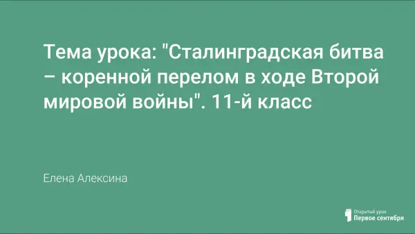 Урок по истории в 11-м классе "Сталинградская битва – коренной перелом в ходе Второй мировой войны" разработан на основе технологии проведения проблемного урока с использованием информационных технологий. Использование компьютерных технологий (описание Сталинградской битвы из программы "От Берлина до Рейхстага", подготовленные слайды) позволяет сделать урок более эффективным, наглядным, интересным, а также помогает применить метод погружения в изучаемую эпоху. Технология проблемного урока способствует повышению мотивации учащихся к обучению, развивает критическое мышление, навыки самостоятельной мыслительной деятельности. Практика подтверждает, что проведение таких уроков повышает качество знаний учащихся, способствует воспитанию у них патриотизма и чувства гордости за своё Отечество.